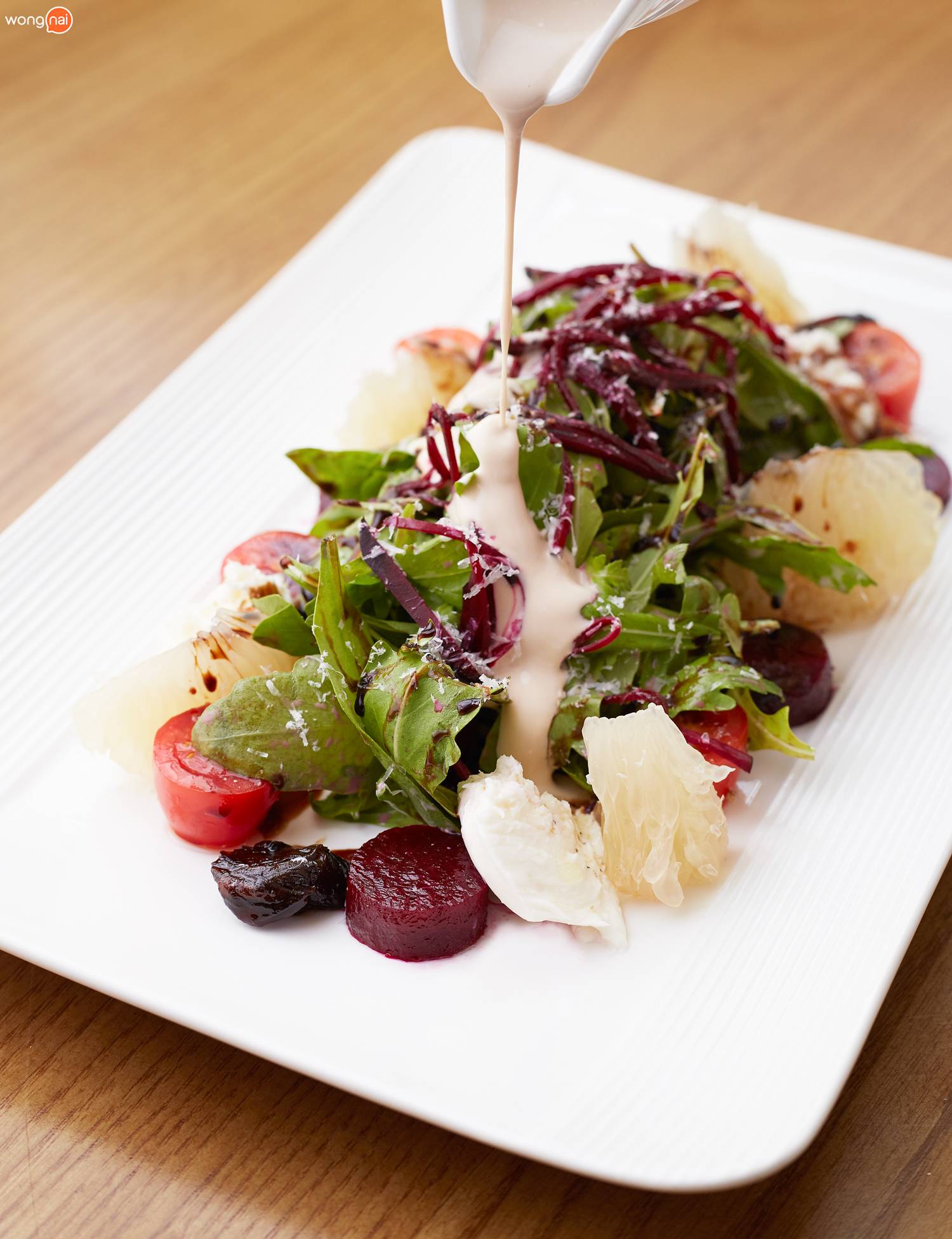 ต่อด้วย “Beetroot Salad” (295 บาท) ผักร็อคเกตคัดพิเศษ เสิร์ฟพร้อม, บีทรูทหมักสูตรเฉพาะ, หัวหอมยุโรปตุ๋นใน Balsamic Reduction, ชีส Bocconcini , มะเขือเทศเชอร์รี, และ ส้มโอ เวลาทานก็เทน้ำสลัดรสกลมกล่อม คลุกเคล้าทุกอย่างให้เข้ากัน เป็นสลัดที่คุณบูมกวาดคนเดียวแทบเกลี้ยง!