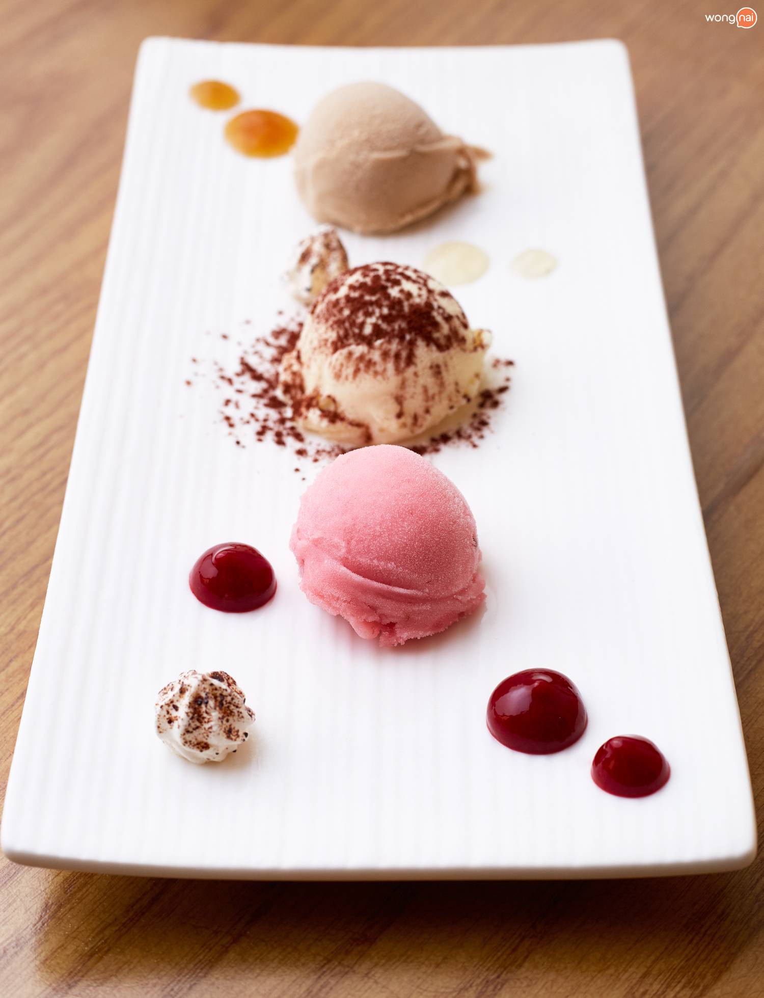 และปิดท้ายด้วยของหวานอย่าง “Gourmet Chocolate Mousse” หรือ “Trilogy of Italian Gelato” เจลาโต้ทำเองของทางร้าน (เลือกได้สามรส)