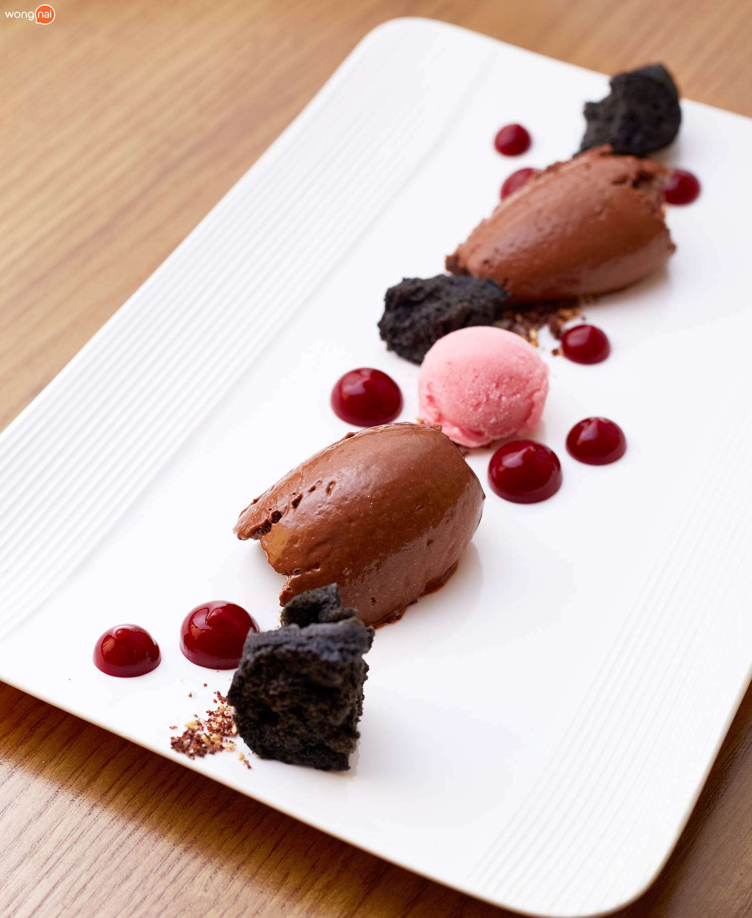 ปิดท้ายด้วยของหวานสูตรเด็ดอย่าง “Gourmet Chocolate Mousse” (175 บาท) มูสช็อกโกแลตทำจาก Couverture ชั้นเยี่ยมอย่าง Valrhona เสิร์ฟพร้อมกับ สปันจ์เค้กงาคั่ว, ไอศกรีมสตรอว์เบอร์รีทำเอง และ แรสป์เบอร์รีเจล