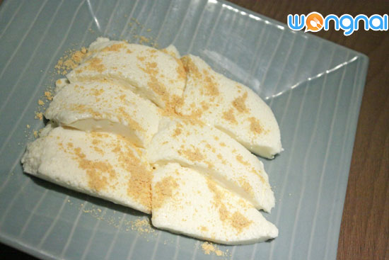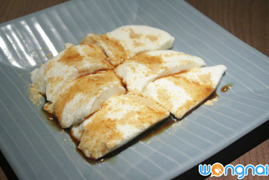 "ไอศกรีมชาเขียวในน้ำเต้าหู้"มาถึงของหวานสไตล์ญี่ปุ่นแท้ๆ ที่แม้หน้าตาอาจจะดูธรรมดาๆ ไปหน่อย แต่รสชาติและคุณค่าทางอาหารนั้นเต็มสิบ ลองเมนูพุดดิ้งน้ำเต้าหู้ "บรามันเจะผสมน้ำเต้าหู้" (ราคา 80 บาท) ที่หน้าตาและสีสันอาจดูไม่น่าสนใจ แต่รสชาตินุ่มนวลละมุนละไมลิ้นสุดๆ เพราะเป็นพุดดิ้งที่เกิดจากการเอาน้ำเต้าหู้ไปผสมกับนม วิปครีม และเจลาติน จนได้ขนมหน้าตาเหมือนเต้าหู้สีขาวๆ นุ่มๆ ก่อนเสิร์ฟจะโรยหน้าด้วยผงถั่วเหลือง พร้อมน้ำเชื่อมน้ำตาลทรายแดง ส่วนเมนูขนมเย็นๆ ชื่นใจสไตล์คนญี่ปุ่น ก็คงหนีไม่พ้น "ไอศกรีมชาเขียวในน้ำเต้าหู้" (ราคา 100 บาท) เป็นไอศกรีมชาเขียวรสชาติหวานนุ่ม มีกลิ่นและรสของของชาเขียวนิดๆ ติดปลายลิ้นมาด้วย เสิร์ฟในน้ำเต้าหู้ พร้อมถั่วแดงกวน วุ้นชาเขียว และแป้งโมจิ อร่อยหวานๆ เย็นๆ กินแล้วชื่นใจ เป็นการปิดท้ายมื้ออาหารได้อย่างลงตัว ครบถ้วนทัังสารอาหาร 5 หมู่ และความอร่อย