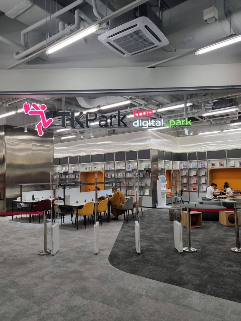 TK Park at true digital park ห้องสมุดในออฟฟิต = ความเงียบแบบ x10 สาขานี้เปิดทุกวัน ไม่ปิดวันจันทร์แล้ว มีห้องเงียบด้วยนะ แต่ที่นี่จะมีหน้าต่าง โปร่ง ไม่แออัด หนังสือเน้นสาย Tech กับ Business แอร์เย็นแบบกลางๆ ไม่ถึงกับต้องพกผ้าห่ม WiFi แรงมาก เลือกได้เลยว่าเอาของ TK หรือ truewifi ที่นั่งทุกจุดมีปลั๊กให้เสียบ ห้องน้ำสะอาด สงบ พร้อมสายฉีด มีจุดบริการเติมน้ำฟรี (อยู่หน้าห้องน้ำ) ครับดูเพิ่มเติม