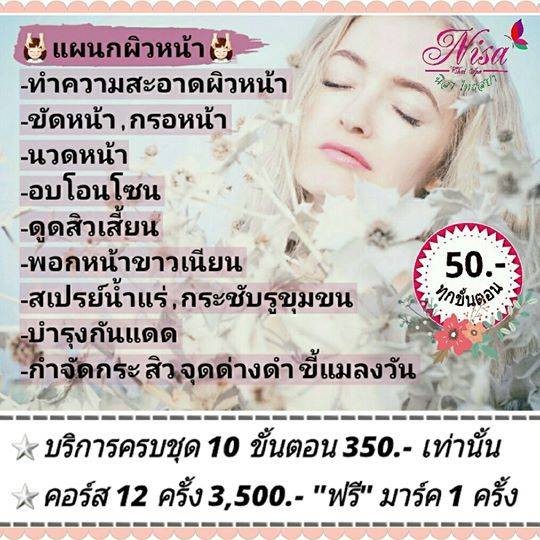 ⭐ SALE ⭐ 40% DISCOUNT 🎎 "นิสา ไทยสปา" สถานเสริมความงามพร้อมสปาเต็มรูปแบบ บริการรักษาปัญหาผิวหน้า สิว ฝ้า กระ จุดด่างดำ รอยแผลหลุม อบสมุนไพร และนวดผ่อนคลาย โดยบุคลากรมืออาชีพผ่านการอบรมหลักสูตร ปรนนิบัติผิวคุณ ด้วยผลิตภัณฑ์คุณภาพจากธรรมชาติ สะอาด ปลอดภัย พิถีพิถันทุกขั้นตอนดูเพิ่มเติม