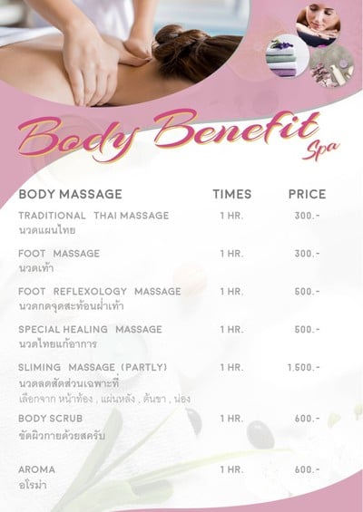 ร้าน body benefit spa. เป็นร้านนวด ทั้งนวดไทย นวดเท้า นวดผ่อนคลาย นวดอโรม่า ขัดหน้า นวดหน้า ขัดตัว. ร้านตั้งอยู่ซอยวิภาวดี 64. ใกล้ๆโรงเเรมเอบีน่า และโรงแรมหลุย ร้านสะอาด. หรูหรา. ราคาไม่แพงเลยคะดูเพิ่มเติม
