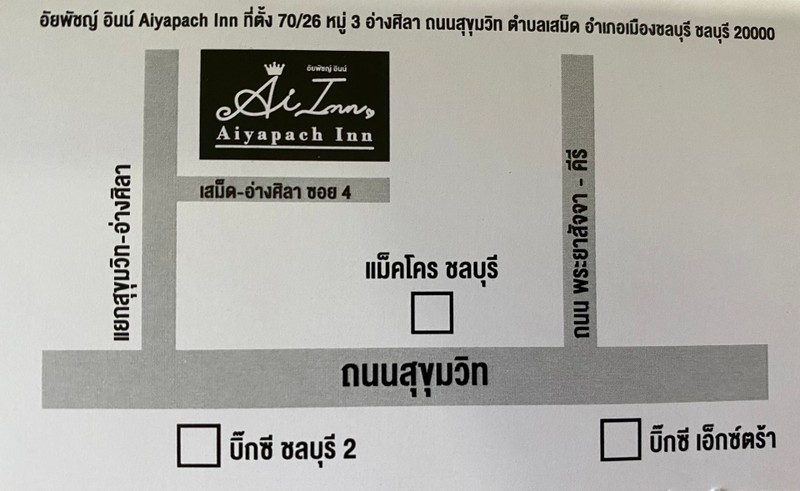 70/26 หมู่3 ซอยเสม็ด-อ่างศิลา4 ถนนสุขุมวิท-แยกอ่างศิลา ชลบุรี (หน้าปากซอยมีร้านอาหารปักษ์ใต้ "คุณน้อง" เข้าซอยมาประมาณ 50 เมตรจะถึงโรงแรม)
