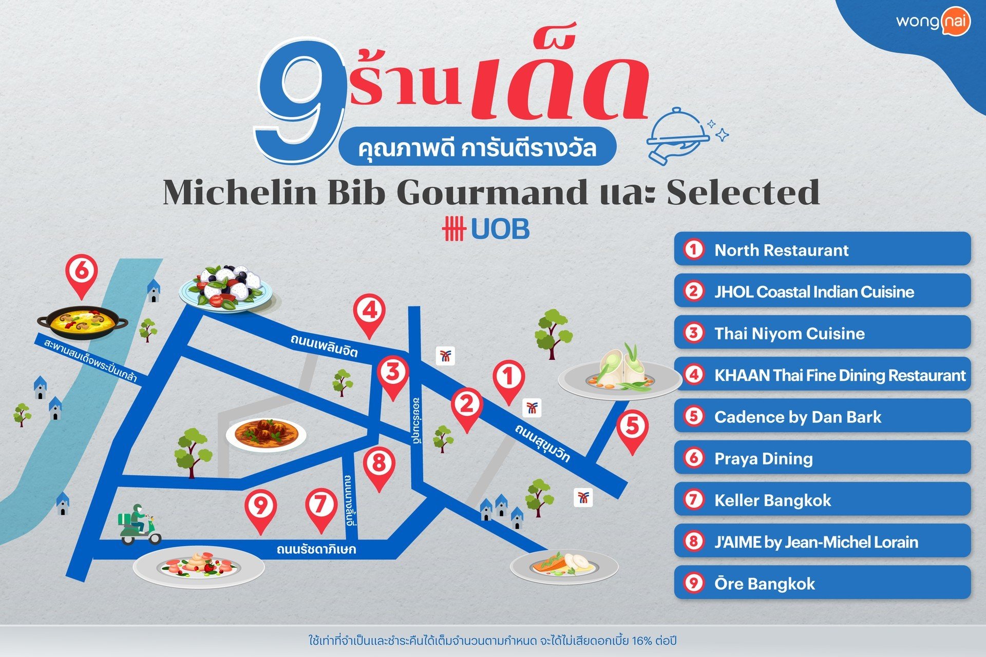 จบไปเป็นที่เรียบร้อย กับ 9 ร้านเด็ด คุณภาพดี การันตีรางวัล Michelin Bib Gourmand และ Selected ที่ทาง Wongnai นำมาฝากกัน บอกเลยว่าเหล่านักชิมตัวจริงห้ามพลาดแม้แต่ร้านเดียว หากคุณกำลังมองหาร้านอาหารสำหรับโอกาสพิเศษ พร้อมเสิร์ฟอาหารรสชาติดี ที่ทั้งประณีตและมีคุณภาพ บรรยากาศดี และราคาสมเหตุสมผล ร้านเหล่านี้คือจุดหมายที่คุณควรมาลิ้มลองสักครั้ง ที่สำคัญแต่ละร้านยังมาพร้อมโปรโมชันสุดพิเศษ สำหรับลูกค้าบัตรเครดิตยูโอบี รับส่วนลดสูงสุดถึง 15%* หรือรับฟรีเมนูสุดพิเศษ* สิทธิพิเศษดี ๆ แบบนี้สำหรับสมาชิกบัตรเครดิตยูโอบี เท่านั้นนะคะ