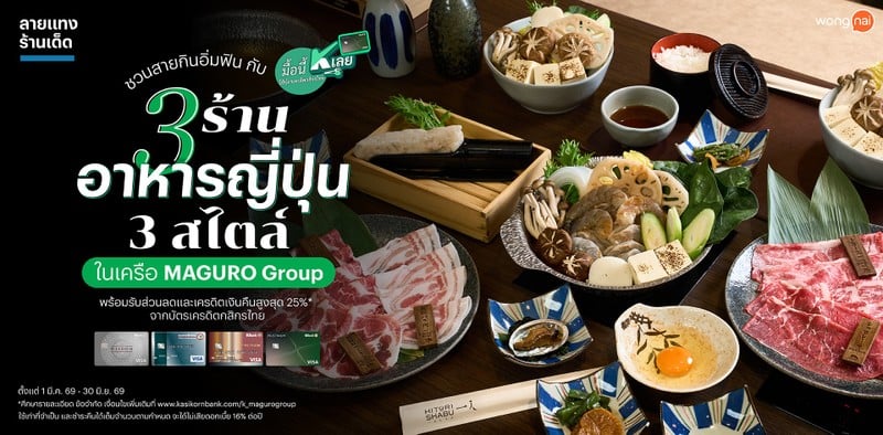 KBank และ Wongnai เอาใจคนรักอาหารญี่ปุ่น แนะนำ 3 ร้านดังในเครือ MAGURO Group พิเศษเฉพาะลูกค้าบัตรเครดิตกสิกรไทย รับส่วนลดพร้อมเครดิตเงินคืนสูงสุด 25%*
