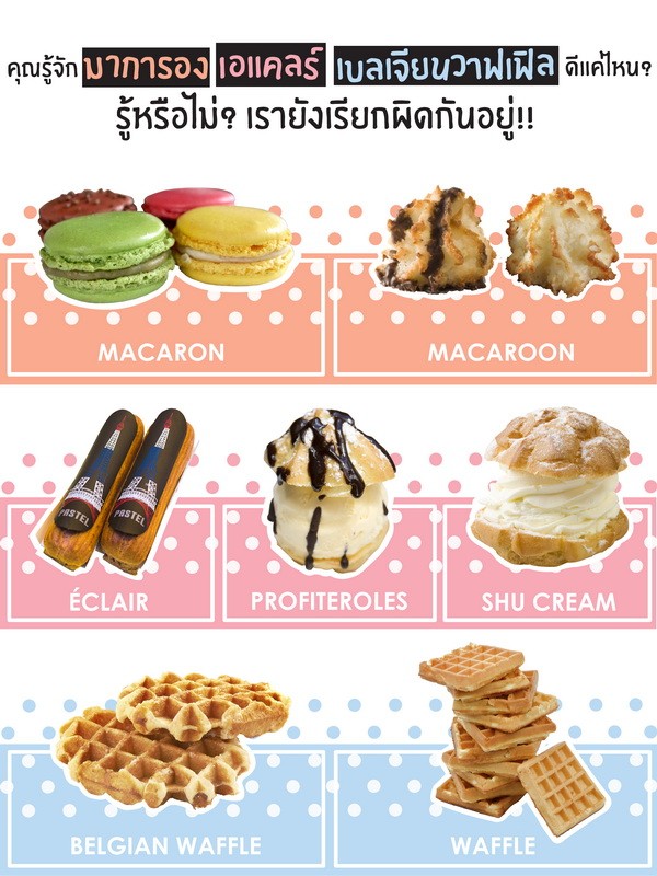 เป็นไงกันบ้างกับเกร็ดความรู้เล็กๆ น้อยของที่มาที่ไปเรื่องชื่อเบเกอรี่ยอดนิยมชนิดต่างๆ ทั้งมาการอง-มาการูน, เอแคลร์-ชูครีม และ เบลเจียนวาฟเฟิล หวังว่าจะช่วยคลายความสับสนสงสัยให้กับทุกคนแล้วนะจ๊ะ จากนี้ไปก็อย่าไปเผลอเรียกชื่อขนมเหล่านี้ผิดอีกล่ะ เห็นใครเรียกชื่อผิดก็บอกเค้าไปเลย นี่! ดูดีมีความรู้มากๆ ว่าแล้วขอออกไปหาขนมหวานมาเพิ่มน้ำตาลในเลือดก่อนนะ เห็นรูปแล้วน้ำลายไหลอ่ะ!