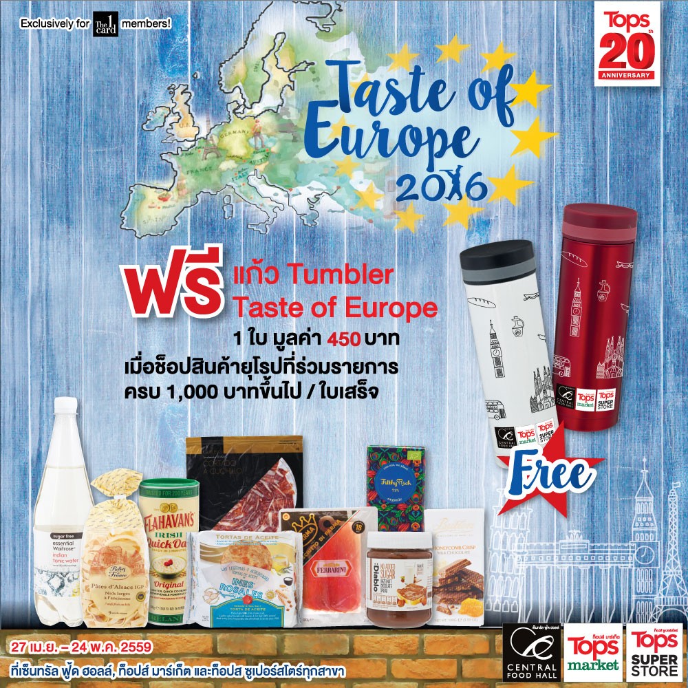 ที่สำคัญ!!! มี โปรโมชั่น ที่ เซ็นทรัล ฟู้ด ฮอลล์, ท็อปส์ มาร์เก็ต และท็อปส์ ซูเปอร์สโตร์ ทุกสาขา รับฟรี! แก้ว Tumbler Taste of Europe 1 ใบ มูลค่า 450 บาท เมื่อช็อปสินค้ายุโรปที่ร่วมรายการ ครบ 1,000 บาทขึ้นไป / ใบเสร็จ ตั้งแต่วันนี้ ถึง 24 พ.ค. 2559 ไปเดินงานทั้งที รับรองไม่กลับบ้านมือเปล่าแน่นอนค่ะ