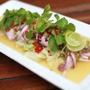 - ปูสรวย (165 บาท) ตกแต่งได้สวยน่าทานมาก คล้ายๆ ฉู่ฉี่ปูใส่มาในกรวยที่ทำจากแป้งทอด ตกแต่งด้วยใบโหระพาแดงพริกชี้ฟ้าแดง รสชาติออกข้นๆเหมือนเมนูแกงแต่พริกแกงไม่เข้มเกินไป ตัวไส้ทำได้อร่อยดีแต่ทานมากๆก็แอบเลี่ยนหน่อยๆ ส่วนตัวกรวยแป้งนี่ต้องปรับปรุงอย่างแรงค่ะ เหมือนเป็นแป้งหนาๆแข็งๆเหนียวๆแบบทอดมานานแล้ว จานนี้ขอให้คะแนนน้อยที่สุดในมื้อนี้ละกันค่ะ