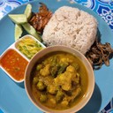 อาหาร ออกจะหวานนำไปหน่อยเป็นร้านที่มีคนใช้บริการอยู่เยอะ มอเตอร์ไซค์จอดกันเต็มหน้าร้านเลย ผมก็สั่งหลายเมนูอยู่ เริ่มที่ข้าวมันแกงไก่ ตัวข้าวมัน ค่อนข้างมัน และติดวานนิดหน่อย กินกับแกงไก่ ถามว่าเข้ากันไหม มันก็เข้ากันในระดับนึง มีมะม่วงเป็นเครื่องเคียงให้ ซึ่งจริงๆต้องเป็นรสเปรี้ยว เพื่อจะได้ตัดเลี่ยน แต่กลายเป็นว่า มะม่วงของเขาก็หวานเช่นกัน