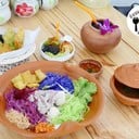 - จริงๆเมนูนี้เลือกเส้นก๋วยเตี๋ยวได้ 1สี ราคา60฿ แต่ขอทางร้านว่าใส่ 3 สีได้ไหม อยากถ่ายรูปออกมาสวยๆ เห็นมีเส้นที่ผสมสีมาจากกระเจี๊ยบสีแดงอมม่วงสีสวยน่าสนใจดี เลือกเส้นที่ผสมสีจากใบเตยสีเขียว และเส้นที่ผสมสีอัญชันสีม่วง รวมเป็น 3 สี ทางร้านคิดเงินเพิ่ม 5฿ แต่พอมาเสิร์ฟแอบตกใจ เส้นเยอะมาก นึกว่าจะใส่ปริมาณเท่าเดิมแต่แบ่งเป็นสามสี แต่นี้เหมือนมาเพิ่มสองเท่าเลย เส้นเลยแอบเยอะไปหน่อย เพราะเครื่องต้มยำใส่ปริมาณเท่าเดิม เลยต้องแยกเส้นออกไว้ส่วนนึงและอีกส่วนคลุกกับเครื่องต้มยำ รสชาติเปรี้ยวกำลังดีไม่เผ็ดมาก ลูกชิ้นกับหมูชิ้น อร่อยดี