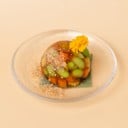มาชั้นแรกของถ้วย เทมาริ เลยจะเป็น สลัด Terrine เป็นการรวม 2 วัฒนธรรม คือ Terrine Technique จากฝรั่งเศส ให้เราได้ลิ้มลองการทานสลัด ในรูปแบบใหม่