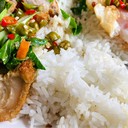 สิ่งที่เห็นอย่างแรกเลยหมูกรอบ หนังฟูๆ ดูแล้วยิ่งน่ากิน ผมเลยสั่งข้าวราดแขนงหมูกรอบ ส่วนไข่ดาวก็ใช้เป็นไข่เป็ด ขาวๆ กรอบๆ ยางมะตูมแบบน่ากินมากครับ