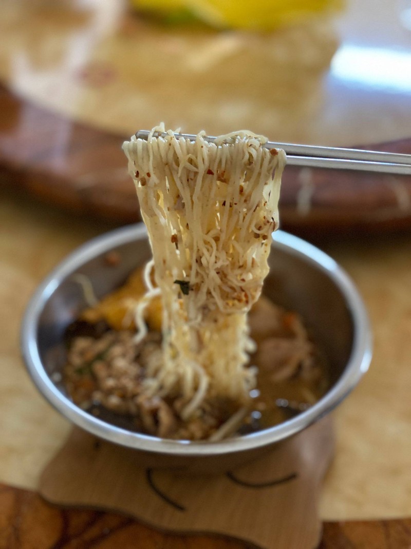 เรากินตั้งแต่เป็นร้านรถเข็นขายบนฟุตบาทริมถนน ตอนนี้มาเปิดเป็นร้านอยู่ใกล้ๆกับที่เดิมนั่นแหละ สูตรการปรุงสืบทอดกันมารุ่นต่อรุ่น ที่นี่เส้นบะหมี่ทำเองเป็นสูตรมาจากอากง อาม่า เป็นเส้นเล็กๆ เรากินทีไรก็สั่งบะหมี่แห้งต้มยำ จัดเต็มมาทั้งเครื่องทั้งเกี๊ยวกรอบชิ้นเล็ก ปรุงชามต่อชาม ใช้มะนาวสดหอม รสจัดจ้านไม่ต้องปรุงเพิ่มเลยดูเพิ่มเติม