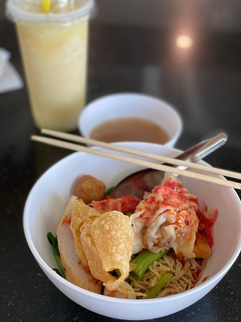 ผ่านบ่อยมาก เพิ่งมาลองชิม ตอนแรกเข้าใจว่าเป็นร้านขายบะหมี่ ก๋วยเตี๋ยว แต่มีอาหารให้เลือกหลากหลายมาก ทั้งสเต๊ก และข้าวหน้าต่างๆ วันนี้กินบะหมี่เกี๊ยวกุ้งเย็นตาโฟแห้ง ชามใหญ่มาก เกี๊ยวลูกใหญ่ เครื่องชิ้นใหญ่ ปรุงมาแล้ว ส่วนตัวคิดว่าน้ำปรุงหวานไปหน่อย แต่เกี๊ยวกุ้ง ลูกชิ้นปลา แฮ่กึ้น อร่อยดี น้ำซุปที่เสริฟแยกมาก็รสชาติเข้มข้น อร่อยดี แต่แวะที่นี่ สายขนมและของกินเล่น น่าจะชอบ เพราะมีให้เลือกเยอะมากดูเพิ่มเติม