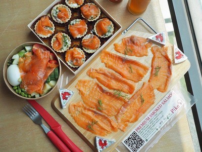 100% ของรีวิวบอกว่าร้านนี้เหมาะกับ เดลิเวอรีแซลมอนรมควันแบบเน้นๆ Homemade cured and smoked salmon ในรูปแบบเดลิเวอรี่ พร้อมทาน Smoked salmon picnic tart (320) ทาร์ตแซลมอนรมควันพอดีคำ เปิดกล่องปุ๊บหยิบเข้าปากปั๊บ แซลมอนรมควันหอมๆ กับครีมชีสหอมกลิ่นเลมอน อร่อยเข้มข้นดี จะกินหน้า comp สั่งไปปาร์ตี้ หรือจะซื้อเป็นของฝาก ของขวัญก็ได้เลย (หรือ 1 กล่องเล็ก มี4ชิ้น ) Original apple smoked salmon (150) ทางร้านจะแล่ปลา หมักและรมควันเองทุกขั้น...อ่านต่อ