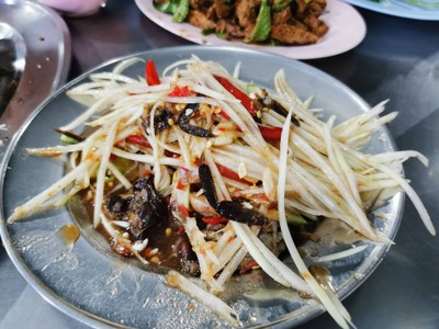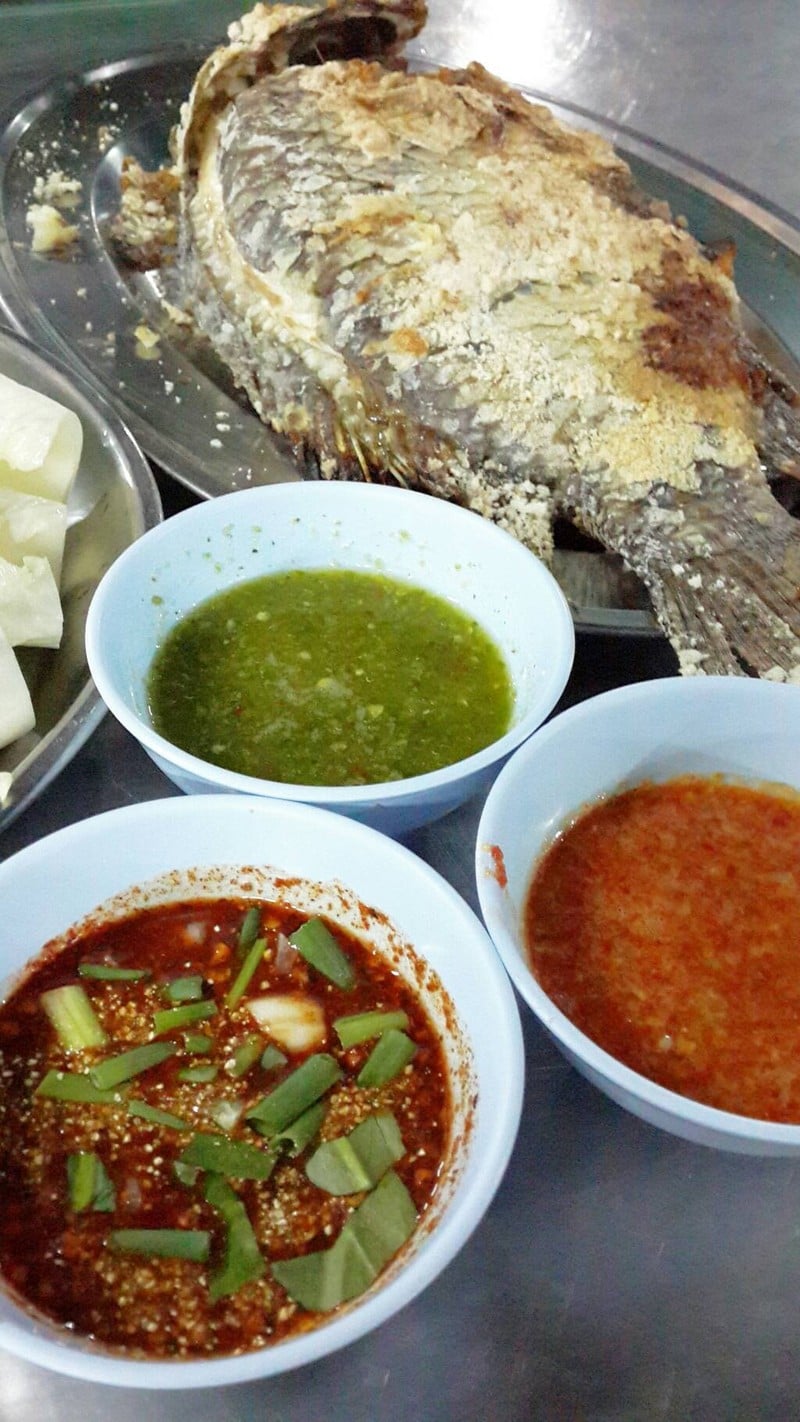 ร้านอยู่ตรงปากซอยบ้านแฟนเลยลองแวะชิมซักที เพราะคิดไม่ออกว่าจะกินอะไรแล้ว คนเยอะมากคะ ต้องเล่นเก้าอี้ดนตรีกันเลย แฟนเคยทาน นางแนะนำว่าปลานิลเผาร้านนี้เด็ด ตัวละ 150 เองอะ ที่สั่งมาอีกก็เป็น ส้มตำปูปลาร้า เส้นกรอบ อร่อยมาก กลมกล่อม อีกจานเป็น ก้อยย่างหมู เหมือนเอาหมูไปคลุกกับข้าวคั่ว กรุบๆ อร่อยดีคะ + สั่งปลาเผากลับบ้านอีกตั รวมบิลมาประมาณ 490 บาทเท่านั้นดูเพิ่มเติม