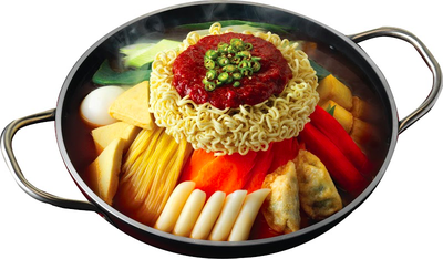 แป้งต๊อกบกกิ ชินราเมียน เส้นจอลเมียน ปูอัด ลูกชิ้นปลา และผักในซุปรสเผ็ดหวานกลมกล่อม