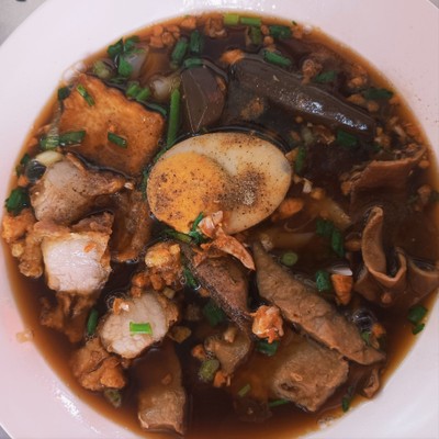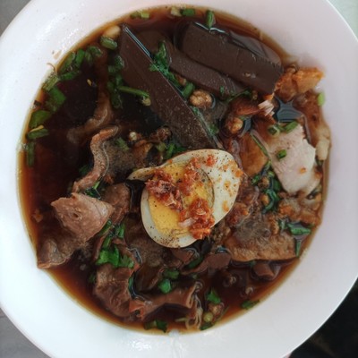 ก๋วยจั๊บเครื่องแน่น สูตรโบราณ ส่วนประกอบใส่ไส้ ปอด เลือด ไข่ เต้าหู้ หมูกรอบ เลือกเส้นได้ มีเส้นหมี่ขาวกับเส้นก๋วยจั๊บ