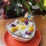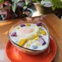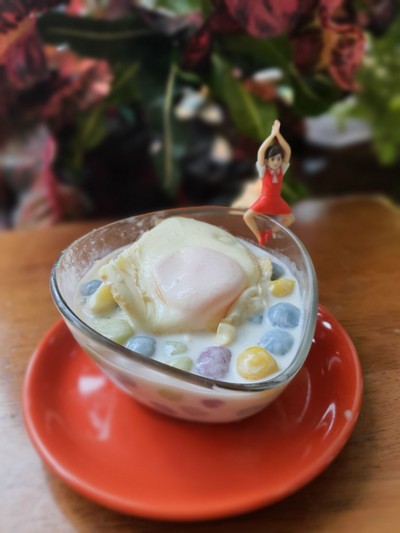 แป้งบัวลอยที่ผ่านการอบควันเทียนผสมกับฟักทอง เผือก มันม่วง ใบเตย อัญชัน แครอท สีที่ได้จากธรรมชาติ ราดด้วยน้ำเชื่อมรสกลมกล่อมและกะทิหอมกลิ่นใบเตย ทานคู่กับไข่หวาน