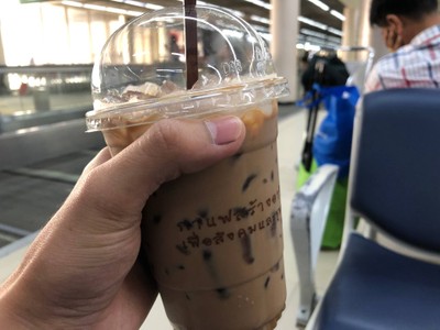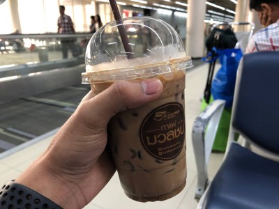 มอคค่าเย็นแก้วเล็ก 50 บาท ตอนแรกพนักงานคิดเป็นแก้วใหญ่ให้เฉย ทั้งๆที่เราสั่งแก้วเล็กไป ยัดเยียดอะไรขนาดนี้เนี่ย รสชาติก็คล้ายๆ All Cafe แหละครับ เพราะอยู่ในเครือเดียวกัน ต่างกันตรงที่กาแฟมวลชนจะใส่ไซรัปช็อคโกแลตเพิ่มเข้ามาด้วย และคงเป็นร้านกาแฟที่ถูกสุดละ ในสนามบินดูเพิ่มเติม