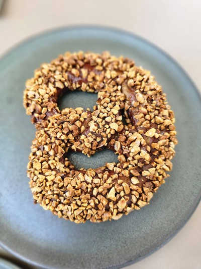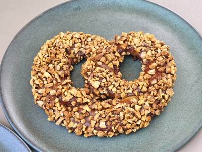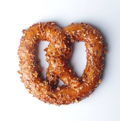 ซอฟท์ เพรทเซลโรยหน้าด้วยถั่วแอลมอนด์ทั้งเม็ดที่นำไปคั่วหอมๆก่อนนำมาสับหยาบและโรยหน้า