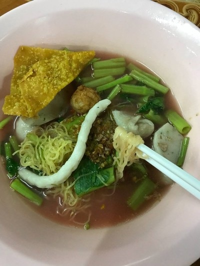 เย็นตาโฟหนองหอย ต้องร้านนี้ บะหมี่เป็นเส้นเล็กเหนียวนุ่ม ลวกใหม่ทุกจาน ไม่เหมือนบางร้านที่ลวกทิ้งไว้เส้นจะเละๆ อาจให้ลองเย็นตาโฟแบบแห้ง รสชาติเข้มข้น อร่อยไปอีกแบบ ในราคา 35฿ ได้ลูกชิ้นปลา คุ้มมากดูเพิ่มเติม