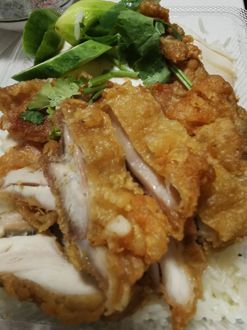 100% ของรีวิวบอกว่าร้านนี้เหมาะกับ เดลิเวอรีไปตอนเย็นๆ คนต่อคิวกันซื้อเลย ทีเด็ดอยู่ที่ข้าวมันไก่ทอด ไก่ชิ้นหนา เนื้อนุ่ม แต่แป้งบางกรอบ ขนาดซื้อกลับบ้านยังคงความกรอบได้ดี ทานที่ร้านคงเด็ดแน่ๆ ส่วนข้าวมันไก่ต้ม เนื้อนุ่ม แต่ข้าวมันไม่ค่อยหอมเหมือนข้าวมันร้านที่เคยทาน น้ำซุป เป็นผักกาดดอง รสชาติดีนะอันนี้ ตัดจรหยดสุดท้ายดูเพิ่มเติม
