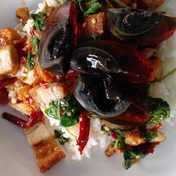 กะเพราถาดพริกแห้งสูตรคุณแม่(ใช้ข้าวหอมมะลิแท้ตราไดโนเสาร์)
