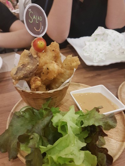 ร้านสลัดชื่อดังย่านนิมมาน จุใจกับปริมาณและความหลากหลายของน้ำสลัด รอบนี้ของสั่ง wrap salad roll มาในรูปแบบสวยงาม เลือก topping ได้ตามชอบใจ เค้าจะใส่น้ำสลัดมาให้เลย กินง่ายกว่าปกติ (แต่ถ้าแตกก็เละเลย 555) ส่วนตัวชอบนะ แป้งที่ห่อมาอร่อยเลย ปริมาณเหมือนน้อย แต่กินไม่หมด เพราะสั่งอย่างอื่นด้วย ส่วนเห็ดชุปแป้งทอดอร่อยดี เนื้อเห็ดเด้งดึ๋งชิ้นโต แป้งทอดมาก็กรอบอร่อยมากดูเพิ่มเติม