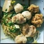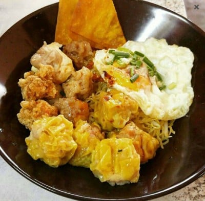 บะหมี่ 2 ก้อน ลูกชิ้น 7 ลูก ขนมจีบ 3 ลูก ไข่ดาว 1ฟอง เกี๊ยวทอด 2 แผ่น