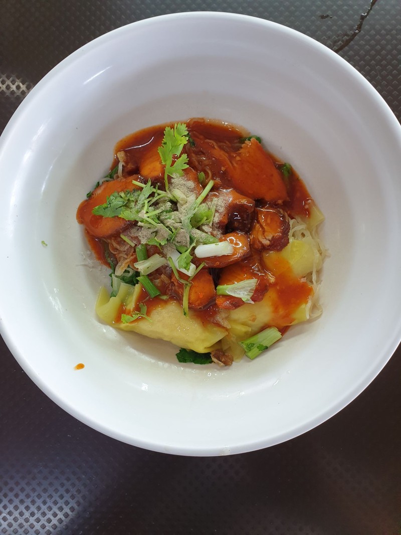 บะหมีเกี๊ยว หมูแดง ราดน้ำซอส