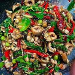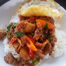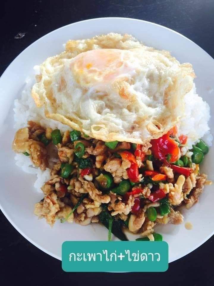 กะเพราถาดพริกแห้งสูตรคุณแม่(ใช้ข้าวหอมมะลิแท้ตราไดโนเสาร์)
