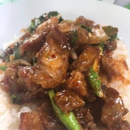 เป็นร้านตามสั่งที่ราคาย่อมเยาว์และที่เด็ดสุดเลยคือหมูกรอบ ที่มีความกรอบนอกนุ่มในมาก ปริมาณก็ได้ค่อนข้างเยอะ รสชาติก็โอเค แต่ไม่มีที่จอดรถและร้านค่อนข้างหายากแต่จะไม่ยากเลยสำหรับคนที่เคยมา เพราะร้านอยู่ติดถนนเลยเพียงแต่ป้ายร้านอันเล็กไปนิดทำให้มองไม่เห็น ขนาดขับตามจีพีเอชไปยังเลยร้านได้ ข้างในร้านมีโต๊ะไม่มากนัก น้ำดื่มมีให้บริการตัวเอง ส่วนความสะอาดพอรับได้ดูเพิ่มเติม