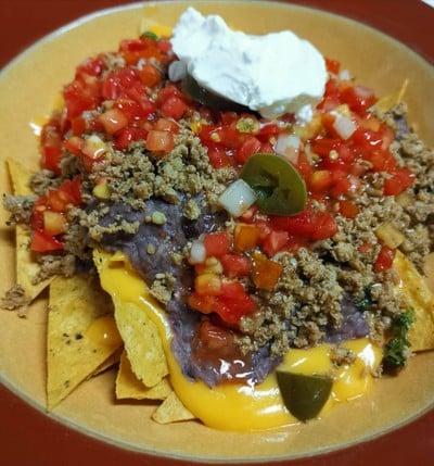 Taco chips topped with taco meat beans cheese salsa sour cream and jalapenos