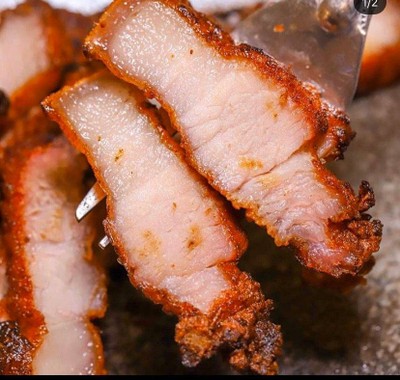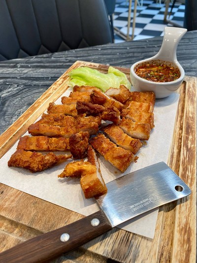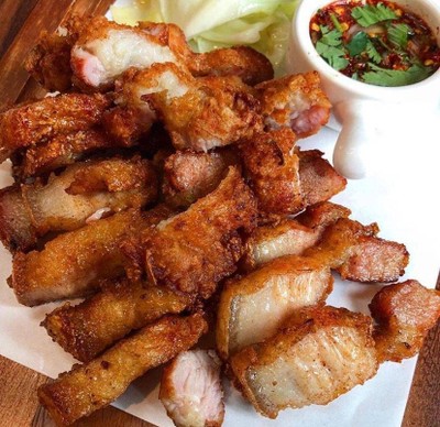 หมูสามชั้นหมักกระเทียมสดและรากผักชีจนเข้าเนื้อ เสิร์ฟจิ้มกับน้ำจิ้มแจ่ว