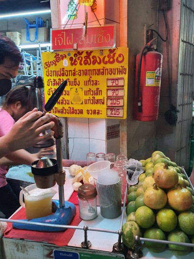 ดื่มน้ำส้มเช้งคั้นสดกัน ร้านอยู่ที่เยาวราช ออกจากซอยเท็กซัส เลี้ยวซ้าย เดินมาอีก 30 เมตรก็ถึงแล้ว สังเกตุมีโต๊ะวางส้มอยู่ วันนี้รอแค่คิวเดียวเอง ส้มเช้งปอกเปลือก แช่เย็น แล้วน้ำมาบีบคั้นกันสดๆ แก้วต่อแก้ว ไม่ใส่น้ำตาล หวานแบบธรรมชาติ ตวงใส่แก้ว แล้วเทใส่ถุง ราคาขายแก้วละ 70 บาท ส่วนตัวว่า แอบสูงเล็กน้อย น้ำส้มไม่ได้เปรี้ยวหรือหวานเกินไป พอกินได้ดูเพิ่มเติม
