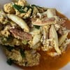 เห็นว่าร้านนี้มีเมนูทะเลอร่อยๆ เยอะนะ แต่เราอยากสั่งแค่อาหารจานเดียวเลยลองข้าวผัดปู ร้านทำเร็ว มาส่งเร็วมาก จานนี้ราคา 100 บาท อยากเรียกว่าข้าวโรยปูมากกว่า เพราะด้านล่างจะเป็นข้าวผัด มีเนื้อปูแยกด้านบน ปูสดดี เราว่าให้คุ้มราคาอยู่ดูเพิ่มเติม