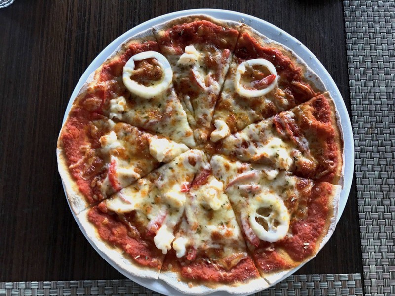 พิซซ่าสไตล์ยุโรป เนื่องจากช่วงที่เราไปเราไปช่วงมรสุม ทำให้ต้องเลือกรับประทานที่โรงแรมที่เราพัก เพราะที่อื่น แม่ครัวไม่อยู่บ้าง บางที่รองรับแค่เฉพาะแขกของทางโรงแรมดูเพิ่มเติม