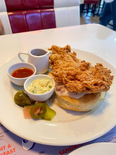 ขอหักคะแนนเดียวเรื่องราคาค่ะ 390.- ส่วนตัวเป็นคนชอบกินวาฟเฟิลอยู่แล้ว งานนี้ทำออกมาได้กรอบนอกนุ่มในมากๆ แต่ความเห็นส่วนตัวรู้สึกว่าเนือเเป้งอร่อยก็จริงแต่มันกลวงไปหน่อยรู้สึกว่าถ้าวาฟเฟิลแน่นกว่านี้จะอร่อยขึ้นกว่านี้อีกเยอะเลยค่ะ ทานกับไก่ทอดคืออร่อยมากจริงๆเมนูนี้บอกเลยว่าถ้ามาแล้วต้องมาลองค่ะ มีค่าจอดรถด้วยนะคะ แฮมเบอร์เกอร์ เฉยๆเลยค่ะ breakfast เฉยๆ เหมือนกัน ที่ควรสั่งคือ chicken waffle ค่ะดูเพิ่มเติม