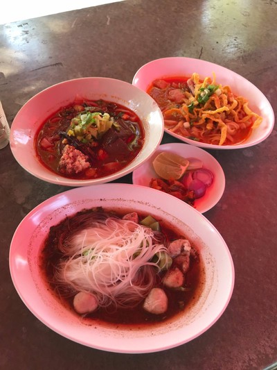 ตอนย้ายมาทำงานที่เชียงใหม่แรกๆ เวลามาปล่อยปลาที่ท่าน้ำวัดชัยมงคล เรามักสงสัยว่าร้านนี้คือร้านอะไรคนเยอะจัง ก็เลยตามหา สรุปว่าคือร้านนี้นี่เอง ร้านก๋วยเตี๋ยวที่ห้อยขาจริงๆ แต่ถ้าอยากนั่งเป็นโซนในร้านก็มีนะคะ เมนูมีเยอะ เป็นประเภท ก๋วยเตี๋ยว น้ำเงี้ยว ข้าวซอย ราคาไม่แพง อร่อย บรรยกาศดีมากๆ พนักงานบริการดี มีที่จอดรถดูเพิ่มเติม