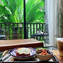 这是一间非常漂亮的雨林咖啡,店主在这里开辟了一片静谧的小天地,穿过矮树和天堂鸟围成的小道就可以到达这件咖啡厅. 咖啡厅的蓝色大门是我喜欢的感觉,店主说因为他喜欢清迈的风格和感觉,所以把这里改建成了自己喜欢的样子,室内需要拖鞋有一个小屋子有空调电视,室外有小露台店主的猫猫🐈咖啡在外面睡觉. 步道最下面是店主的小花园,偶尔会有小松鼠经过🐿️. 🍛Rice set chicken garlic(89泰铢):这个套餐好好吃,炸过的蒜炒猪肉好香,米饭还是紫米饭,有肉有煎蛋有沙拉价格超便宜. ☕️Iced Latte拿铁咖啡(85泰铢) 这里非常的适合很休闲的过一天,因为我喜欢小猫咪会觉得这里更有趣,这里的饭好吃又便宜,超多的外卖员来取餐,店主有趣又健谈,对我来说非常值得!ดูเพิ่มเติม