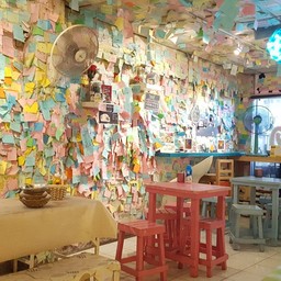 ร้านนี้เต็มไปด้วย post it ตกแต่งด้วยผู้คนที่ในร้าน ต่างเขียนข้อความต่างๆลงใน post it แล้วนำไปแปะที่ฝาผนังตามร้าน เมนูนม ขนมปัง ต่างๆ รสชาติโอเคอยู่ ผมเองเครื่องดื่มที่สั่งบ่อยก็ โอวัลตินไวมอลล์ ขนมปังปิ้งหมูหยองพริกเผาดูเพิ่มเติม