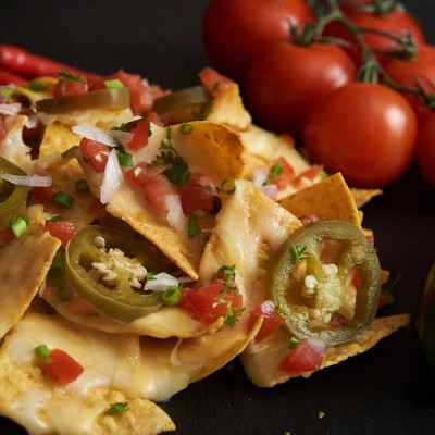 แป้งข้าวโพดทอดกรอบโรยหน้าด้วยชีสพรีเมียมรสชาติดี 4 ชนิด, พริกจาลาปิโน่ และซัลซ่ามะเขือเทศสดหั่น,ซัลซ่าปิโก เดอ กัลโล