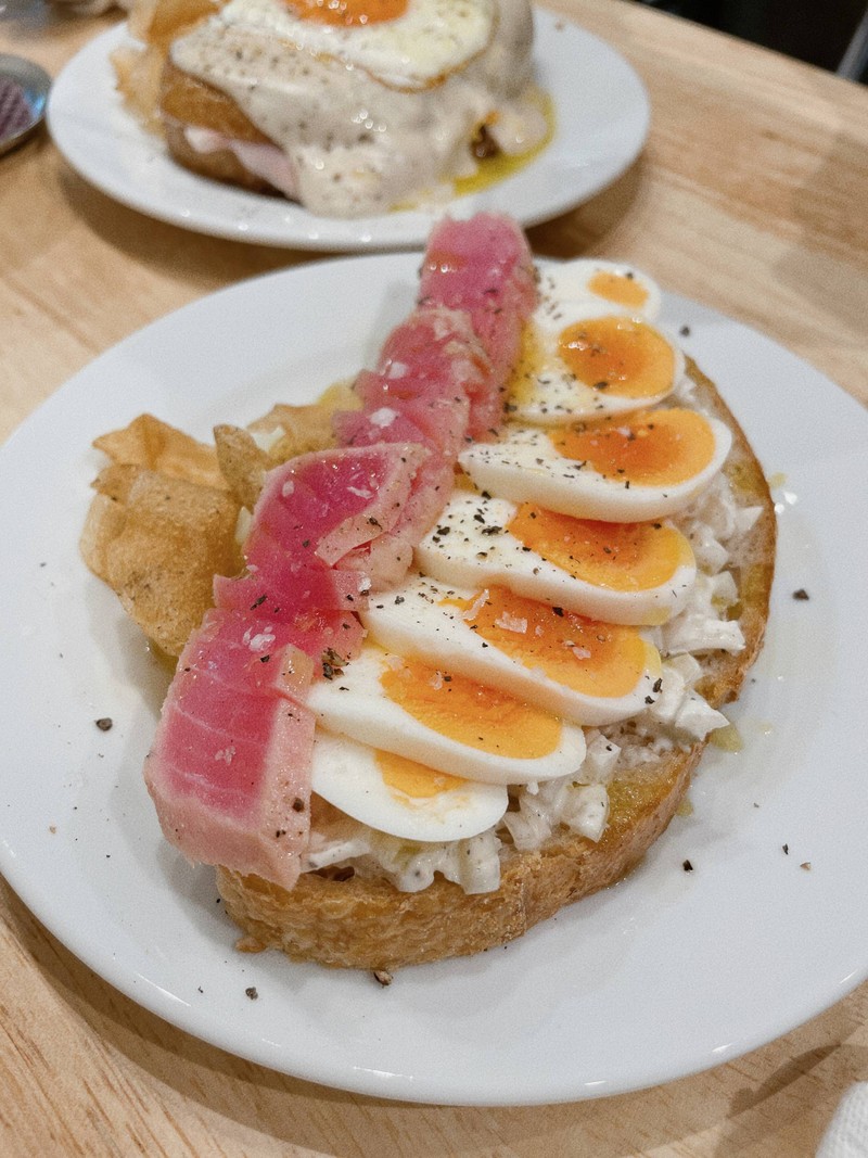 ขนมปังซาวร์โดสไลด์ ใส่ทูน่ามีเดียมแรร์ ไข่ต้มและทาร์ทาร์ซอสใส่แตงกวาดอง หอมใหญ่ กระเทียมและมายองเนส