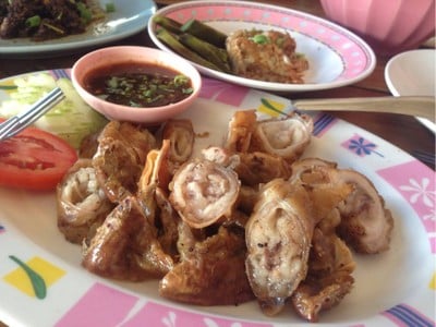 วันนี้จะมาแนะนำ ร้านอาหารพื้นเมือง ในตัวเมืองเชียงดาว สามารถจอดรถหน้าร้านได้เลย มีป้ายชื่อร้านริมถนนชัดเจน เลยปั๊ม PT มาไม่ไกล ที่ร้านขาย ลาบ สุก-ดิบ แกงอ่อม ต้มแซ่บ พวกย่างๆ วันนี้สั่ง ลาบหมูสุก รสชาติดี หอมเครื่องเทศ ที่สำคัญ ผักสดให้กินคู่กับลาบ เยอะมากๆ อร่อยครับ เมนูต่อไป ไส้ย่างบวกหมูสามชั้นย่าง ไส้ย่างแห้งดีครับ อร่อย หมูวามชั้นก็กรอบอร่อย และที่ไม่ควรพลาด แกงอ่อมเนื้อ เป็นเครื...อ่านต่อ