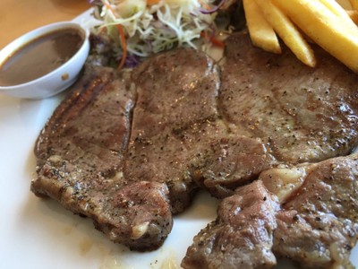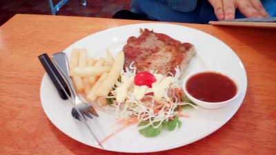 ตอนกลางวันแดดร้อนหนักมาก มีเวลาน้อยเลยขอนั่งตากแอร์เย็นๆข้างในร้านอาหารสักร้านก้อมาเจอร้านนี้พอดี ก่อนถึงซอยเข้าวัดกำแพง ถนนพิบูลสงคราม มีที่จอดสะดวกสบาย ข้างในร้านแอร์เย็นชื่นใจ อาหารรอไม่นาน บริการโอเคเลย -สเต็กหมู ราคาเริ่มต้น 69 บาท เนื้อสันนอกหมักเครื่องเทศได้เข้าเนื้อหอมๆนุ่มๆกำลังดี ขนาดและรสชาติสมราคาดีด้วย -BG beef steak ถ้าจำไม่ผิดน่าจะเป็นส่วนสันนอกแล่ชิ้นหนานุ่มพอดีๆ รสเนื้อหอมนุ่มใ...อ่านต่อ