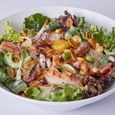 สลัดไก่ย่าง อร่อยสไตล์ญี่ปุ่น เพิ่มโปรตีน หอมกลิ่นน้ำมันงาและงาคั่ว เข้ากันกับถั่วอบน้ำผึ้ง และผักสลัด 5 สี สดใหม่รสชุ่มฉ่ำ **ขออภัยคุณลูกค้า ไม่สามารถเปลี่ยนแปลงรสชาติและวัตถุดิบในรายการอาหารได้**