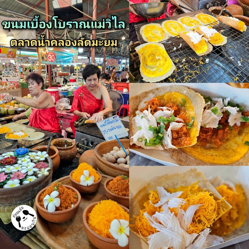 ไปเดินตลาดน้ำคลองลัดมะยมอีก ก็แวะร้านขนมเบื้องโบราณแม่วิไลอีก มาช่วงเย็นตลาดเรื่มวานแล้วแต่ร้านก็ยังเปิดอยู่ ซื้อขนมเบื้องไส้หวาน 3 ชิ้น 100 บ. ขนมเบื้องแป้งกรอบ เครื่องแน่นๆ ไส้หวานไม่หวานมากไปกำลังดีดูเพิ่มเติม