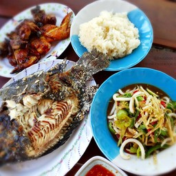 100% ของรีวิวบอกว่าร้านนี้เหมาะกับ เพื่อนฝูงเป็นร้านอาหารอีสานท้องถิ่นโดยคนท้องถิ่น เปิดขายอยู่ในบริเวณวัดถ้ำเอราวัณ ซึ่งก็มีอยู่หลายร้านให้เลือกทาน จุดขายของร้านนี้ก็คือ "ข้าวปุ้นฮ้อนแป้งสด" รายการอาหารก็เน้นไปที่เมนูส้มตำต่างๆ ไก่ย่าง และปลาเผา น้ำปลาร้าหอมและรสชาติกลมกล่อมดีครับดูเพิ่มเติม